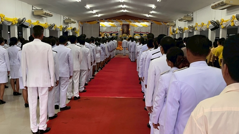 ผู้ร่วมพิธีจะยืนสงบนิ่ง และถวายบังคมพร้อมกัน